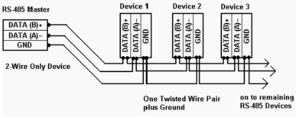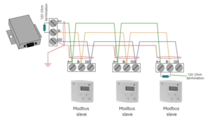 • Ef samskiptanetið er stórt (miklar vegalengdir) gæti þurft að setja 120 Ohm endaviðnám yfir gagnaparið á síðasta tækinu. Sum tæki eru með innbyggðan möguleika til að virkja endaviðnám.